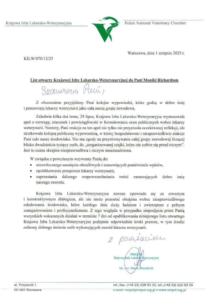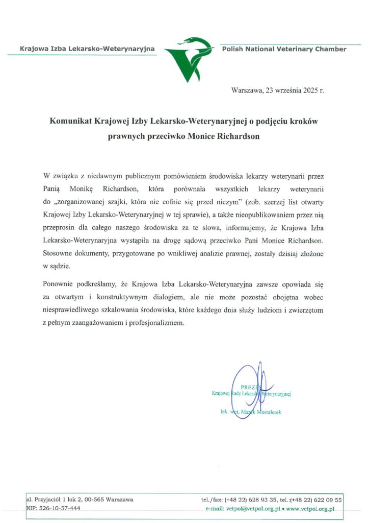 Krajowa Izba Lekarsko-Weterynaryjna, zamiast podjąć merytoryczną debatę o standardach komunikacji i etyce, odpowiedziała agresywnym atakiem PR-owym. 1 sierpnia 2025 r. wystosowano „List otwarty”, żądając przeprosin i grożąc krokami prawnymi. 23 września 2025 r. Izba zakomunikowała, że „stosowne dokumenty przeciwko Monice Richardson zostały dzisiaj złożone w sądzie”.